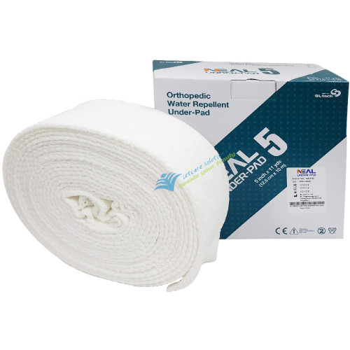 Cuộn lót chống thấm nước Neal Under-Pad NUP-5100 (12.5cmx10m) giúp bảo vệ da, vùng bị ảnh hưởng từ nẹp và suốt quá trình băng bó bột trong các trường hợp gãy xương, nứt xương hay bong gân,... hoặc cần cố định xương khi chỉnh hình. Loại này được sử dụng chung khi thực hiện băng bó bột. Nó giúp bệnh nhân có thể tắm hay bơi, không giống như các loại cotton hay băng khác khi thực hiện chung với băng bó bột. BL tech co., Ltd. sở hữu bằng sáng chế tại Hàn Quốc.