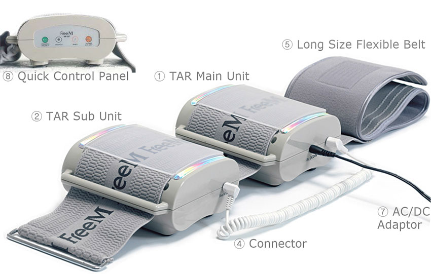 9. Bạn có thể sử dụng 1 máy massage chính ( ① TAR Main Unit ) với dây đai ngắn áp dụng cho những trường hợp trong hình sau: